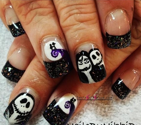 Jack and Sally make for best Halloween nail art design ideas because they are favorite characters for the theme.
