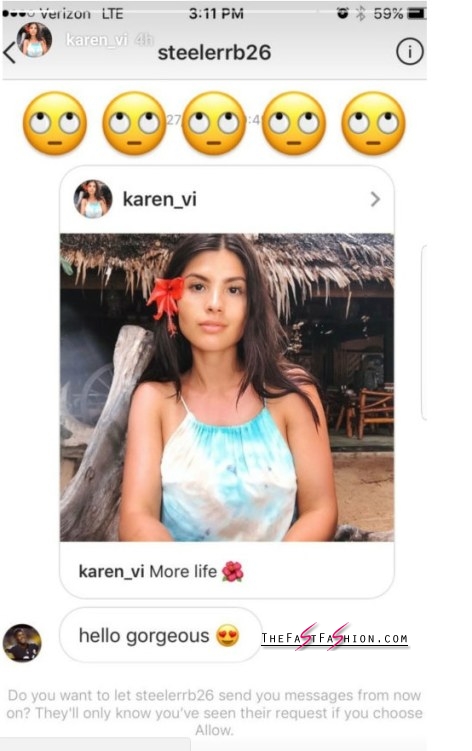 Pittsburgh Steelers running back Le’Veon Bell came across the lovely Karen Vi on Instagram one day and decided to slide up into her DMs. Big mistake, bub! Bell says to Karen, “Hello Gorgeous,” and you should see what happens next…