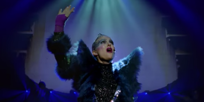 As in the film’s previous trailer, some other striking images include Cassidy riding a motorcycle while wearing a glittery mask, Portman breaking down in tears and snippets from the pop star’s go-for-broke live show.