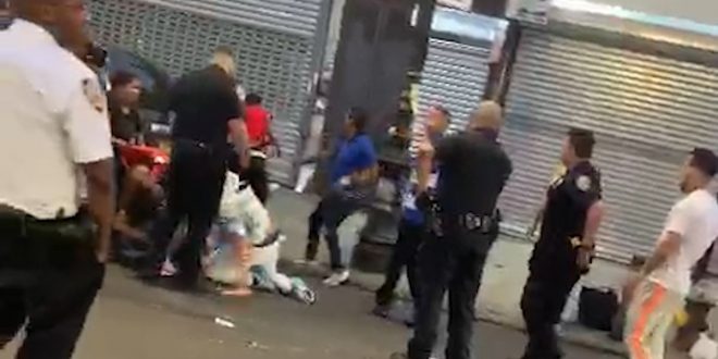 A brawl between at least seven men broke out in Inwood while cops just watched on, a video obtained by The Post Sunday shows.