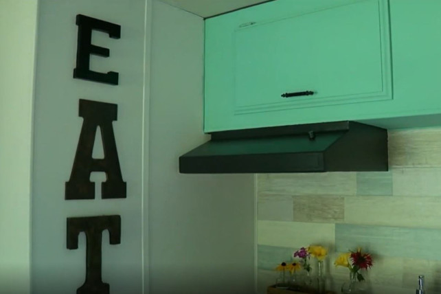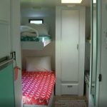 Basic drab wooden cabinetry became an airy, teal-hued working kitchen, while the rest of the camper features a sleek, all-white base with pops of color from key decor elements such as pillows, flowers and patterned sheets on the bunk beds. And a tiny pink and blue sign reads, “Lauren’s Lil Camper.”