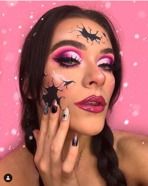 If you want to spook fellow Halloween-lovers this year, all you have to do is doll yourself up like a cracked porcelain figurine and embrace a daring (and borderline scary) look with your makeup. This haunting costume is cool yet creepy, and will definitely turn heads. To recreate it at home, it’s best to free-hand sporadic cracks all over your face using a black fine-tip waterproof eyeliner. A pencil works well for the larger areas and a liquid felt-tip version will help define the thin lines — aka “cracks.” Then, go all out with eye makeup — brightening white liner along the lower lash line is a must for achieving a doe-eyed effect, as are false lashes and multiple coats of mascara.